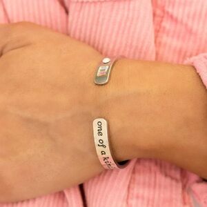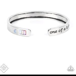A minimalistic silver bar etched with the words, “one of a kind” on one end and embellished with a dainty rhinestone and pastel gems on the other, curves into a simple cuff around the wrist. New