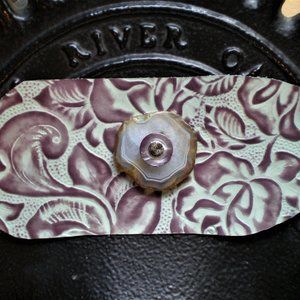 This is a Gorgeous piece of embossed leather in a light blue and taupe colors. The focal point is an amazing piece of agate which matches so well. I further embellished the agate with an antique blueish grey mother of pearl button in center of agate w/ a vintage rhinestone in center of button. Really an eye catching bracelet.
