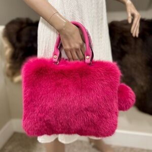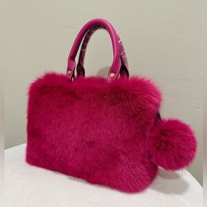One of a kind! Brand new. This gorgeous and stylish fluffy tote is handmade from premium dyed genuine Fox fur, with leather handles. Stunning light magenta color. Includes a removable Fox fur Pom ball bag charm.