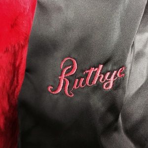 Calf length, cherry red rabbit fur coat! It was given to me and used once for a photo shoot. In vintage condition: a few splits in the seams and mismatched buttons. Fur is clean and soft but lining/pockets are perfect. Embroidered with name "Ruthye" on inner right side lining. Reasonable offers welcome!