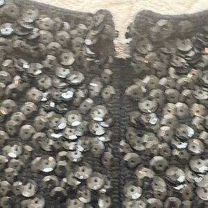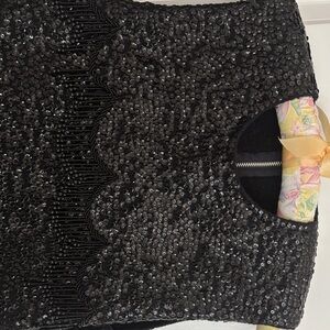 Elegant sequined top hand sewn with impeccable detail. No sizing but appears to be small. 17.5 inches across the chest, and 2- inches from shoulder to hem. Back zipper closure with a hook and eye to finish it off. Heavy beading. It’s truly special.