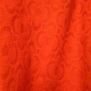 Design class final. A+! Great colors, pretty fabric, fully lined in orange red. Rich, saturated orange both pieces. Top: square neckline, bracelet length sleeves that end in trumpet that is repeated in the skirt. Design is native inspired with metallic gold accents. Seamed to fit. Back zip halfway up back. Chest 40. Curved bottom hem 44. Skirt: 34 at waist,42 at hips, 38 long from waistband to hem. Trumpet/mermaid bottom is a complete circle. You won't ever see another of this special dress.