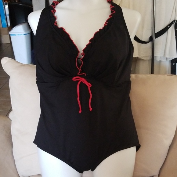 Retro style 1 peice swim suit with flirty ruffled neck line