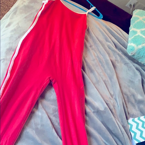 One piece, pinkish red color. The fabric is soft & stretchy. Since it goes all the way to your ankles it can be worn all seasons. In colder weather it would go well with a Jean jacket.