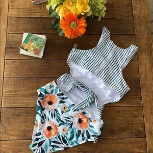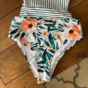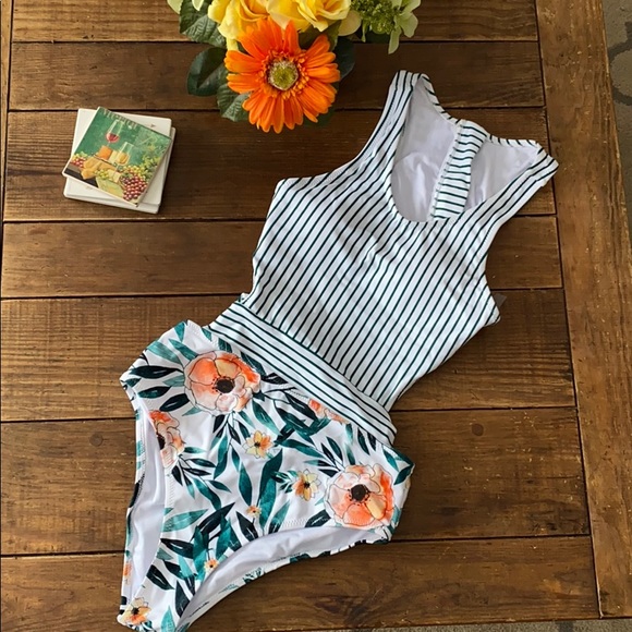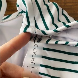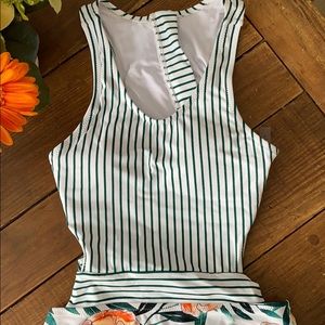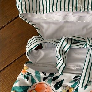 Green striped one piece with side cutout design that ties on back. Worn to try on but doesn’t fit me correctly. The sanitary sticker and tags are not present. No obvious signs of wear.