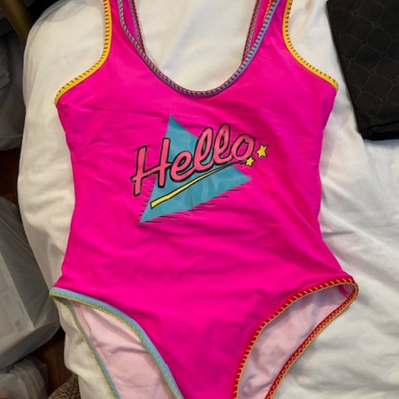 Hot pink one piece swimsuit with multi-color stitching around the shoulders and bottom. Never worn.
