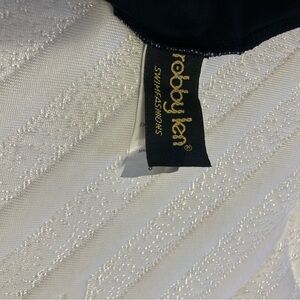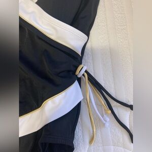 Retro black one piece swimsuit with white and gold accents. Black, white, and gold tie at waist. Built in cups. Full bottom coverage Size 8