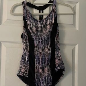 One piece pink, purple, and black print bathing suit with built in padding - SM