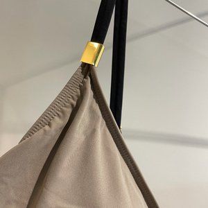 One piece swimsuit in black and beige with golden details on the straps and a skinny belt around the waist. Shaping swimwear