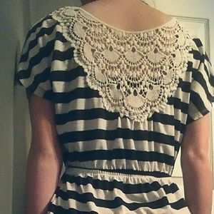This cute horizontal black and off white striped shirt will make you the talk of the town! This shirt is super cute and comfy and in amazing shape. Hardly ever worn. This shirt also features a beautiful crochet back piece across the top to give you that nice boho chic look! Its a must have!!!