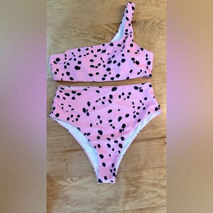 One shoulder 2 piece Bikini Leopard Print Pink and Black EUC Size Medium