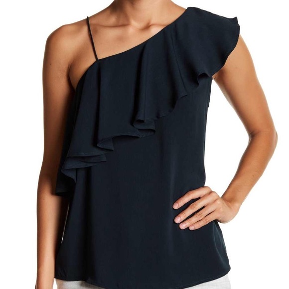 Deep forest green (only looks black in the picture) ruffle blouse. Has a strap on the side opposite the ruffle so it's balanced.