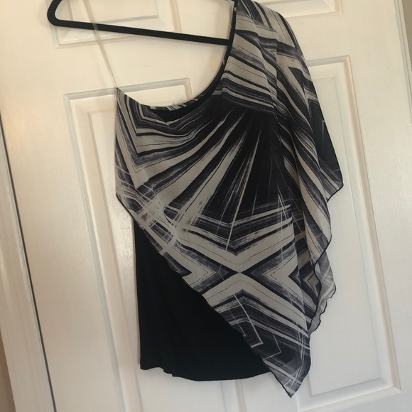 White/black/gray sheer one shoulder top with sewn in black tank top underneath