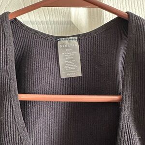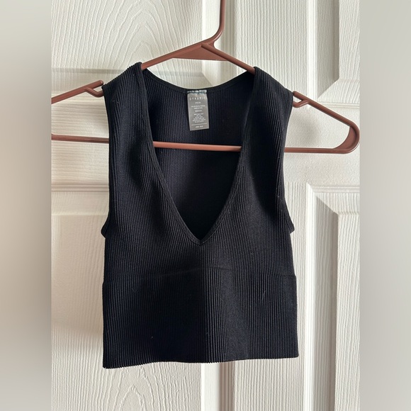 One size fit Ribbed cropped tank Very compressed no bra needed So stretchy! Worn once