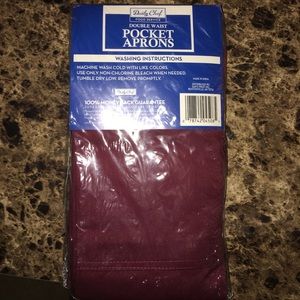 In this package, by Daily Chef food service, there are three 65% polyester and 35% cotton beautiful burgundy colored aprons. These aprons hold superior quality and performance. Never used, freshly sealed.