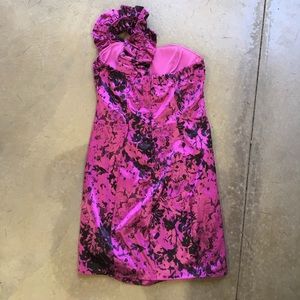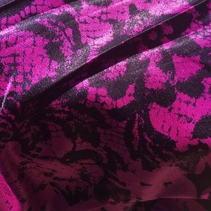 Pink with black floral designs. Zips on side. Fringes in front and on thick shoulder strap. Size 9. Only worn twice