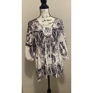 This tunic top combines style and comfort with its intricate paisley print and adjustable drawstring empire waist, ideal for casual or semi-formal settings.