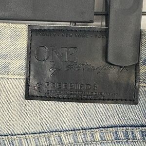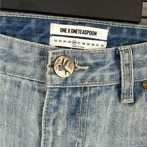 One x One Teaspoon Denim Distressed Patch Work Straight Leg Blue Jeans Size 26. In good used condition. Zippers at the bottom of both legs. 80% cotton, 20% polyester. Ask me anything!