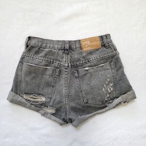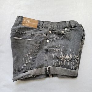 One x One Teaspoon jean denim shorts crafted from premium distressed denim. These shorts feature a flattering mid-rise fit, and cuffed hems, and exude effortless cool. Perfect for beach days, festivals, or casual outings, these One Teaspoon shorts are a must-have. It is in great preowned condition.