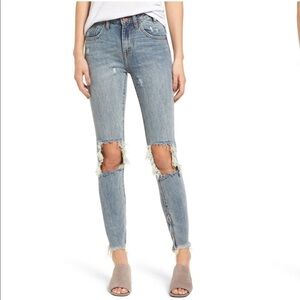 Heavily shredded knees, distressed details and a faded wash give rough-and-tumble attitude to high-waisted skinny jeans cut from nonstretch denim. To amp up the cool factor, hidden zippers vent the raw, cropped hems.