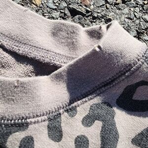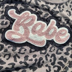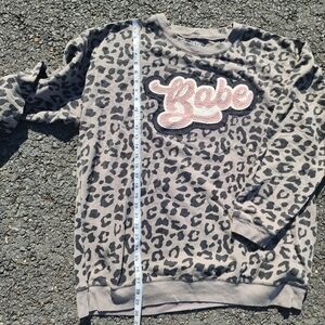 Stylish gray leopard print sweatshirt featuring a pink 'Bebe' logo. Any flaws shown.
