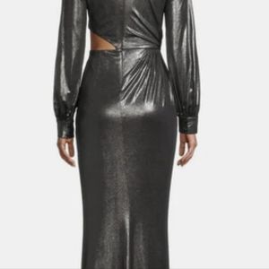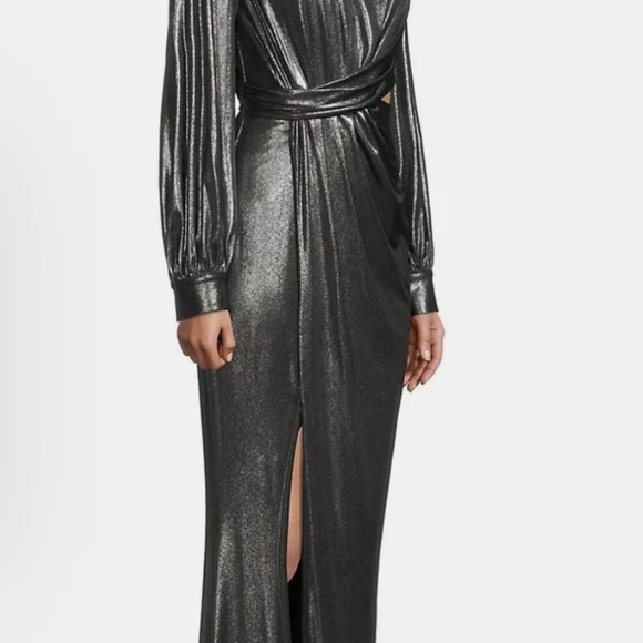 Silver foil knit sleeve gown with high side slit and long sleeves - Sheath silhouette
