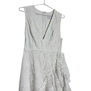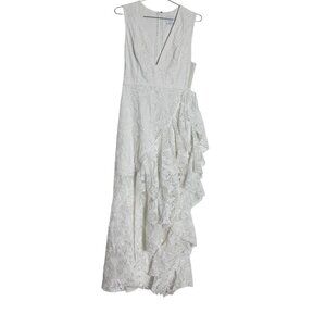 White lace (100% Polyester). Hourglass. V-neck. Sleeveless. Back zipper closure.
