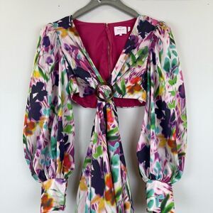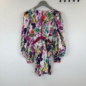 Pink and purple chiffon (95% Polyester, 3% Spandex, 2% Metallic). Romper. V-neck. Long sleeves. Back zipper closure.