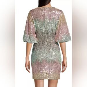 Glamorous sequined minidress features flared elbow-length sleeves set in an ombre design.