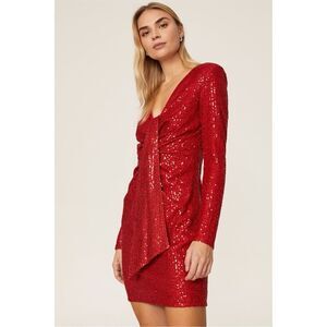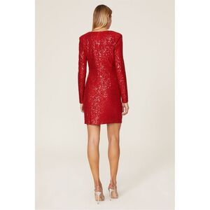 Red sequins (92% Polyester, 8% Spandex). Sheath dress. Plunge neckline. Long sleeves. Back zipper closure. 34Short from shoulder to hemline.