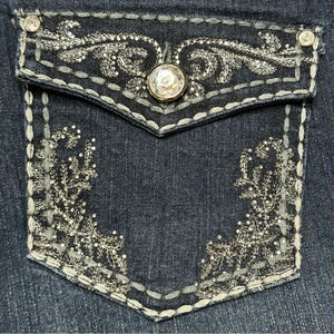 Features: Dark wash lightweight denim, stud embellished back pockets, standard zip and button closure