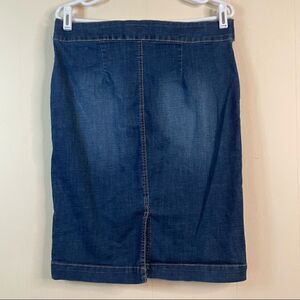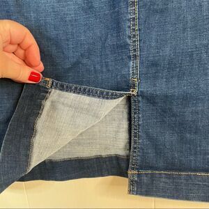 This cute skirt is in excellent pre-owned condition. It is denim and has a belt attached and it ties in the front. The skirt is knee length and has a little slit in the back. It gives off 70’s vibes for sure!