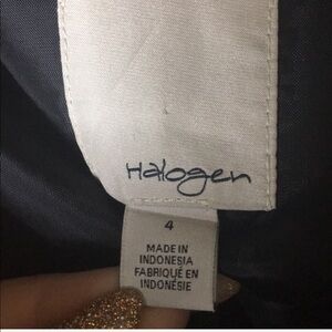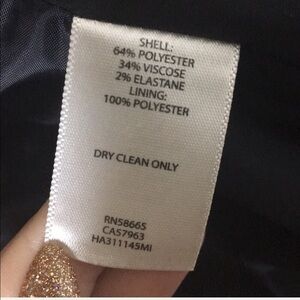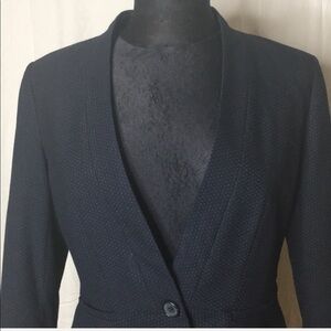 A textured stretch-woven suiting jacket streamlined with no lapels is tailored with a peplum hem for a figure-flattering silhouette.