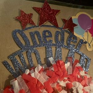 Above the band is blue “ Oneder Woman ” lettering topped with 3 RED stars (gold stars pictured in 1st photo, actual item has red stars, shown in packaged photos). Lettering and stars made from heavy weight premium glitter paper.