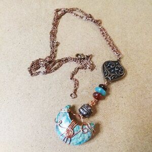 This Jasper moon is a lovely blue-gray/green mottled color with some tan and silver mixed in for good measure. I used both copper jewelry wire to create the wire wrapped design and securely capture the stone, as well as copper colored connector sections, plus a 3 flat Agate Bead Stack somewhere in the middle to pull it all together. A ornately textured copperchain is hardwired into the bail and finishes the oppulenntly delicious appearance of this statement necklace.