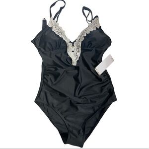 Black One-Piece Swimsuit with Lacy V-Neck, silver hardware. New with tags