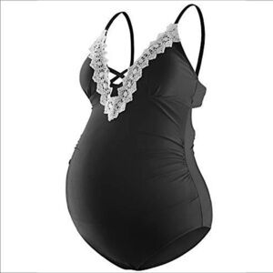 One-Piece Lace Trimmed Dark Goth Maternity Swimsuit Black V-Neck Size Me…