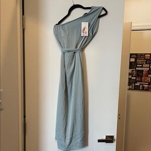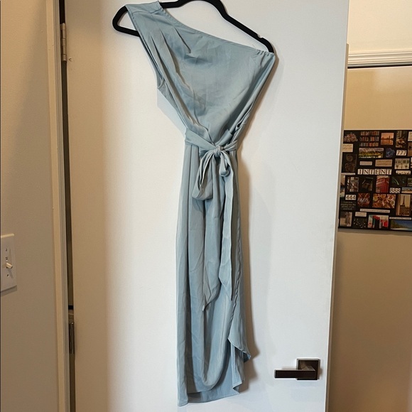 One shoulder light blue midi dress with removable tie around waist. Never worn.