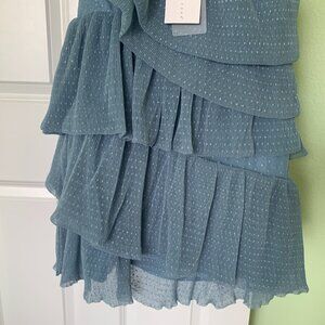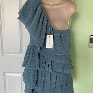 Elegant one-shoulder dress featuring cascading ruffles in a beautiful blue hue. Perfect for any occasion.