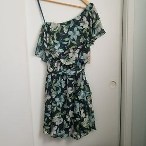 Party ready in lightweight chiffon, with a contemporary one-shoulder neckline and a vibrant floral motif.