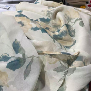 Soft cream-colored dress with delicate blue floral prints. Features a one-shoulder design with thin adjustable strap and an asymmetrical hem for added flow and elegance. Lightweight and airy fabric makes it perfect for both casual outings and dressier occasions.