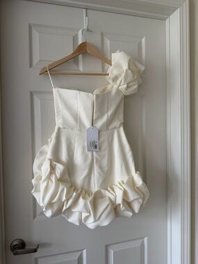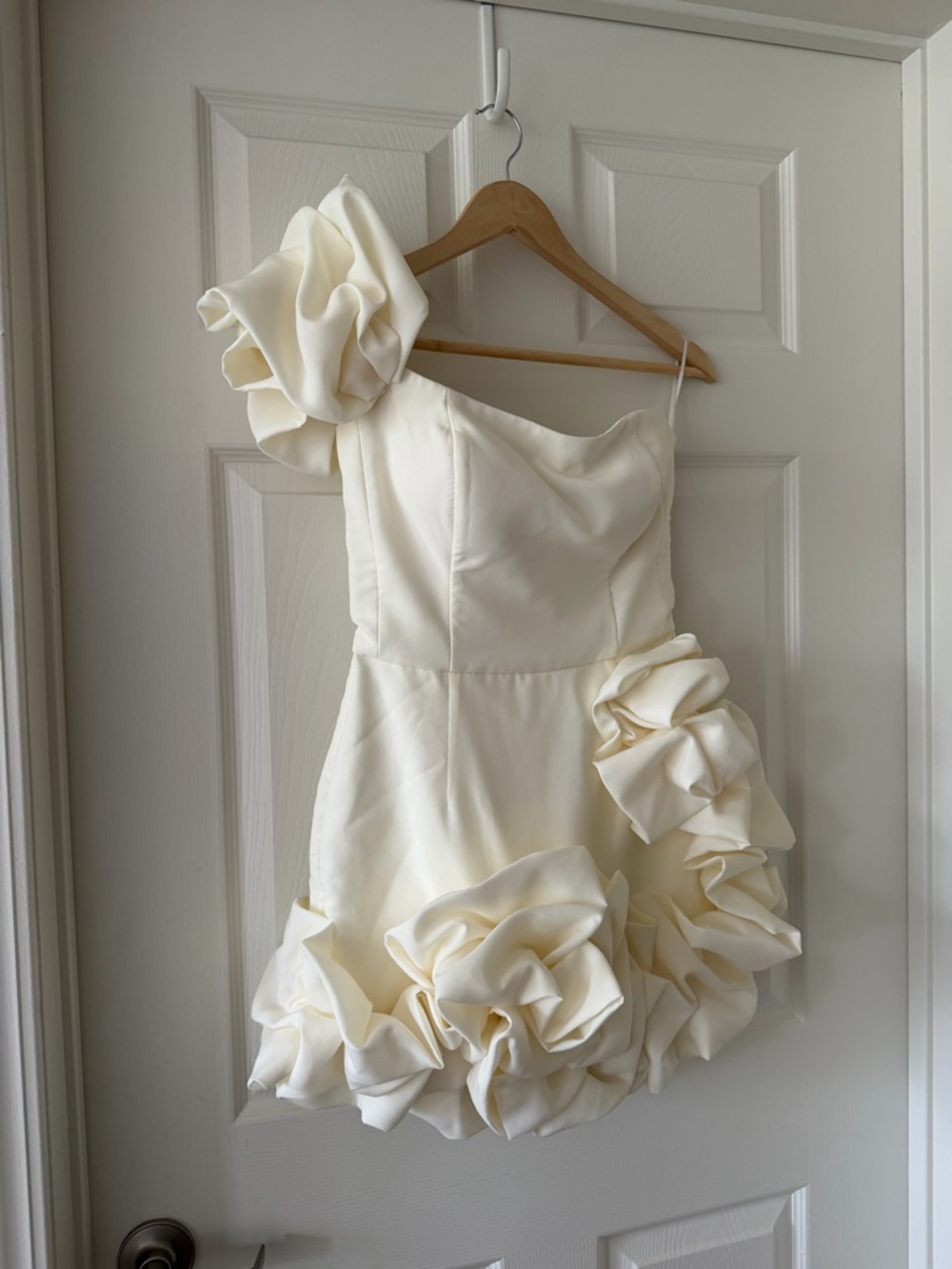 Elegant one-shoulder dress in ivory with dramatic ruffle accents. Soft cream fabric creates a flattering silhouette. Perfect for special occasions and evening events. Features statement ruffles on shoulder and hem for a fashion-forward look.