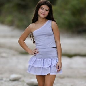 Stylish one-shoulder top and skirt in lavender. Trimmed in delicate lace to give it a sofisticated and feminine look Features a playful ruffle skirt .