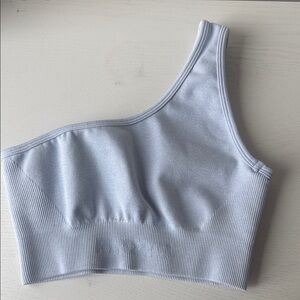 Stylish one-shoulder ribbed top in light gray. Perfect for casual wear.