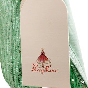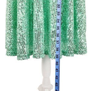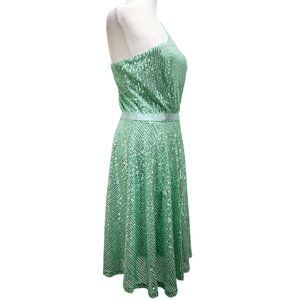 One-Shoulder Light Green Sequined Dress With Ribbon Waist Flowing Skirt Size M
