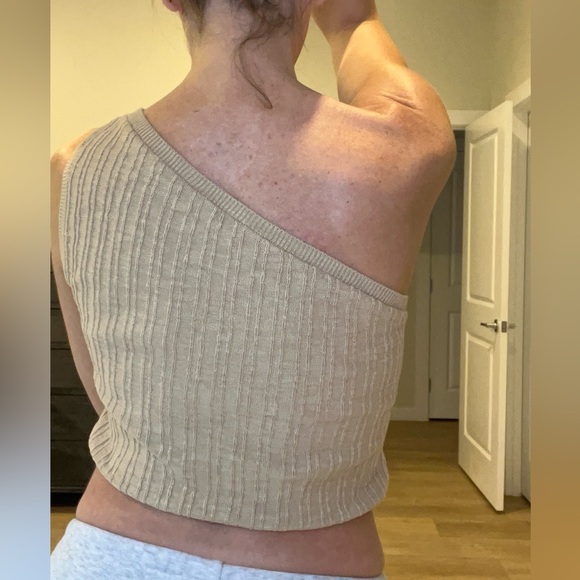 Stylish one-shoulder ribbed knit crop top in a neutral tan. Says XS but this fits like a medium