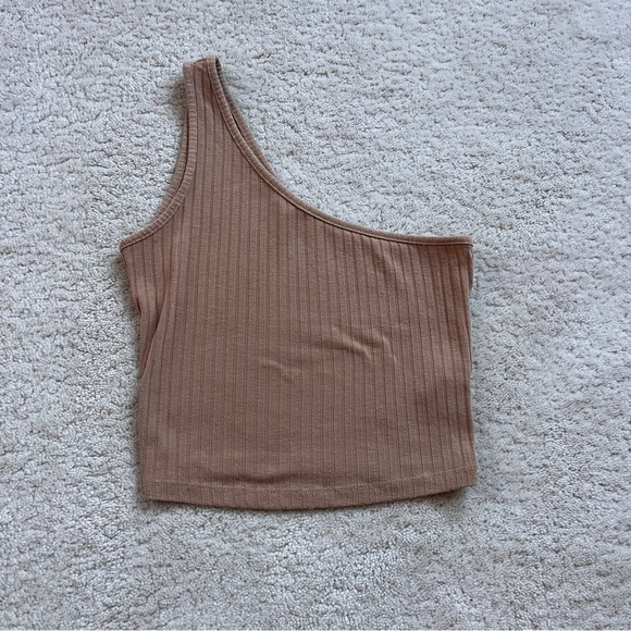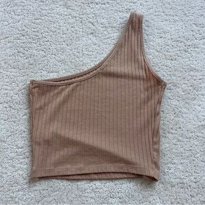 Elevate your style with this chic one-shoulder ribbed top. Perfect for any occasion, this beige top offers a modern and elegant look. Love this color it matches with so many clothing options.