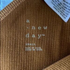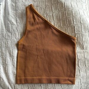 A new day one-shoulder ribbed top. Color is a burnt orange/brown. Slightly cropped. Worn once to a wedding.