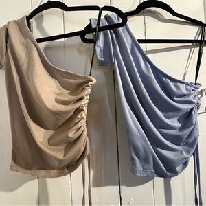 Stylish one-shoulder tops with ruched detailing. Available in tan and blue. Both size small