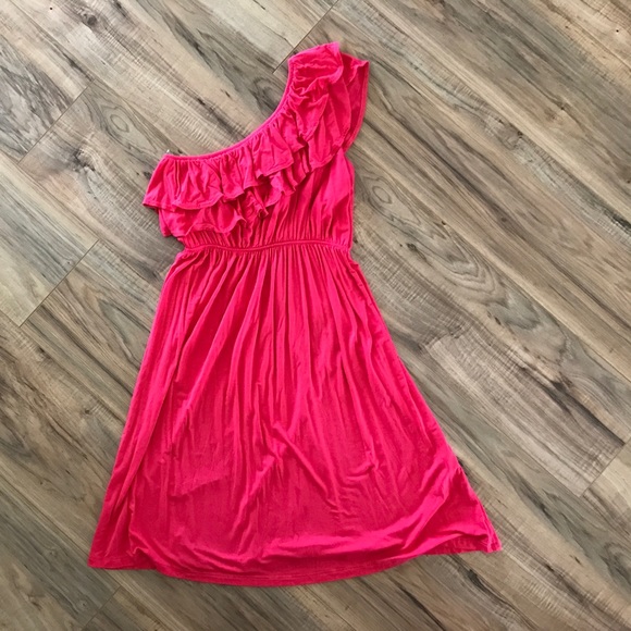 Like New Adorable One-Shoulder Ruffle Dress - Magenta, Size Large. I'm 5'3" and it hits a few inches above the knee. This is perfect for spring!! Smoke-free home. Excellent Condition!! Only wore once! These ruffles are amazing!!